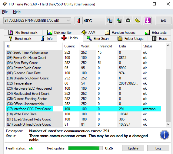 Ahoj, tak jsem testoval disk pomocí HD Tune a našel viz. obrázek 1. - hodnota ale u toho nebyla.. U záložky Health, tak tam jsem měl jedno upozornění - viz. obrázek 2. Nevíte, co to přesně znamená? Je disk velmi poškozený?