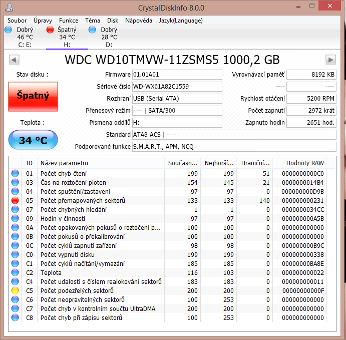 Dobrý den, pravděpodobně došlo k mechanickému poškození externího disku (WD My Passport). Důsledkem toho je veškerá práce s diskem VELICE pomalá, prakticky nemožná. SMART test: Chyba v položce: Reallocated Sector Count: Value 133, Treshold 140, Worst 133, Warranty 1. Vím, že disk je kaput, jde mi po...
