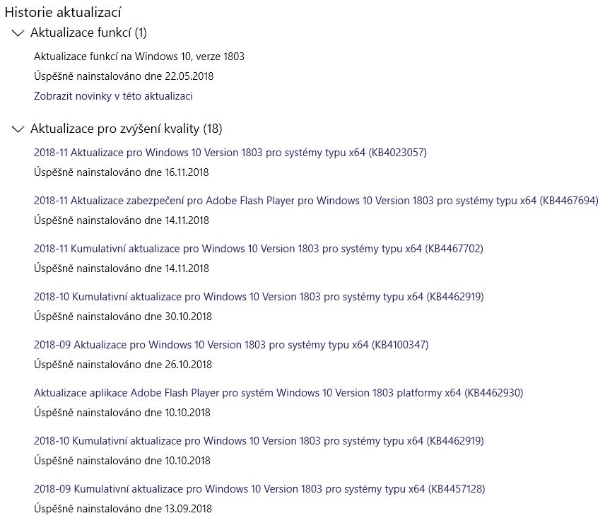 Moje verze systému Windows 10 je 1803 a build je 17134.407. To co je na screenu je aktualizace ze dne 16.11.2018 nebo-li poslední aktualizace co se mi provedla.
