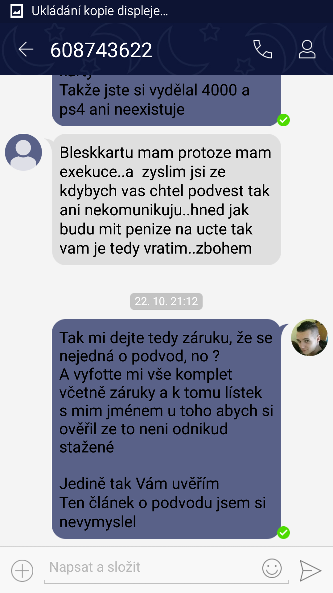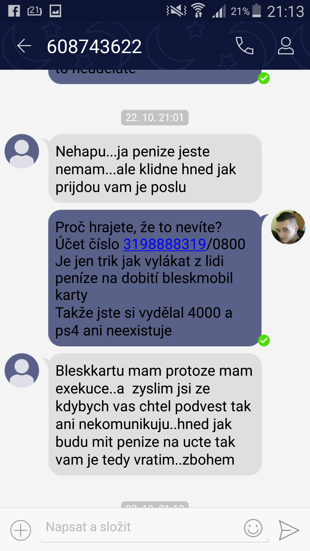 Stalo se tak včera, jednalo se o PS4 za 8000kč a po domluvě jsem poslal předem na účet (ano tento dobíjecí ... ) 4000Kč