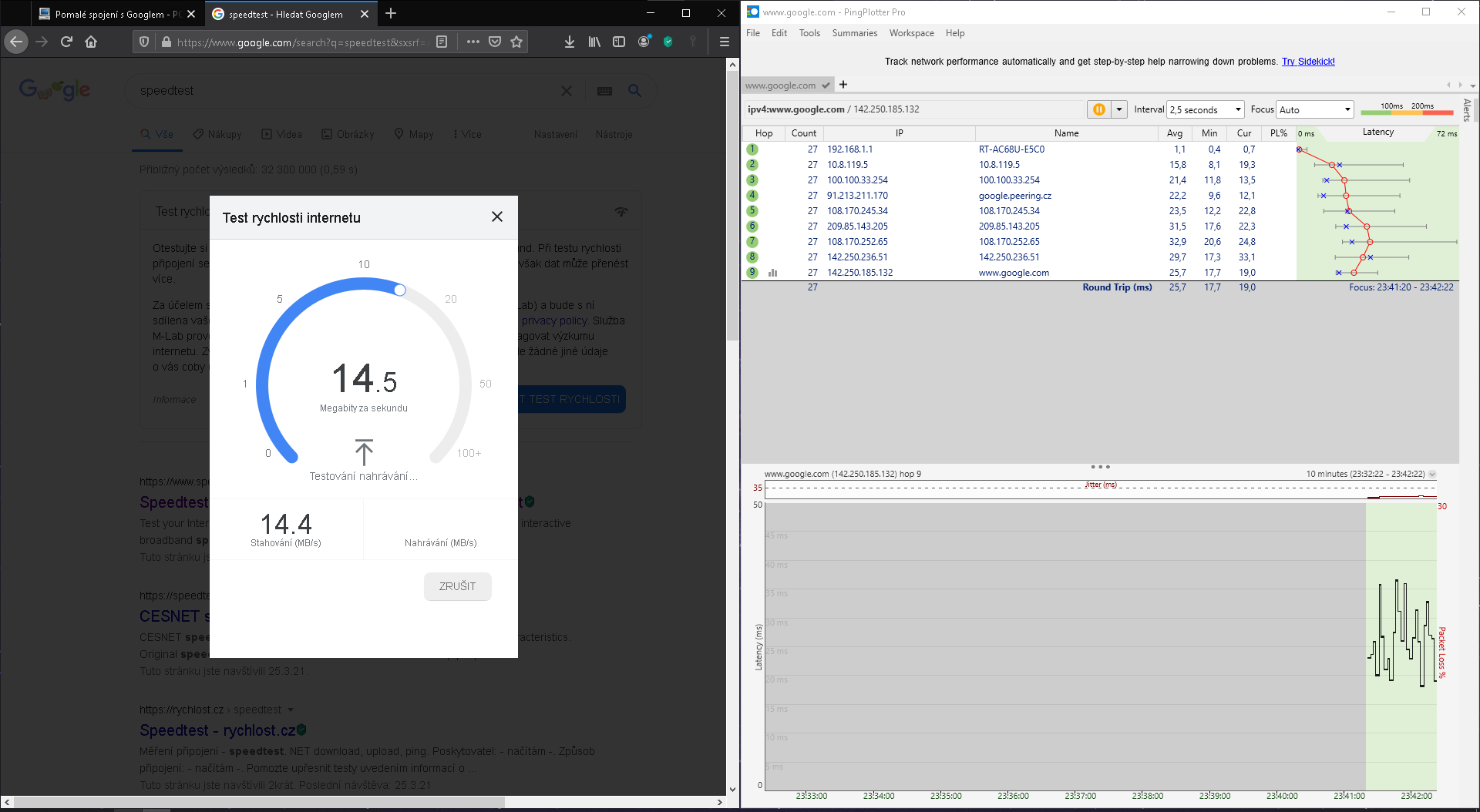 Tady je screenshot, Google speedtest mi zůstane vždy zaseklý.
