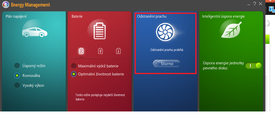 Ten větrák se roztočí na max, běží asi 10 vteřin a pak se to opakuje, dokud se neklikne na storno. Pokud je ten nb v čistém prostředí kde se nekouří, pak je to užitečná funkce, pokud se to dělá cca 1x týdně.
