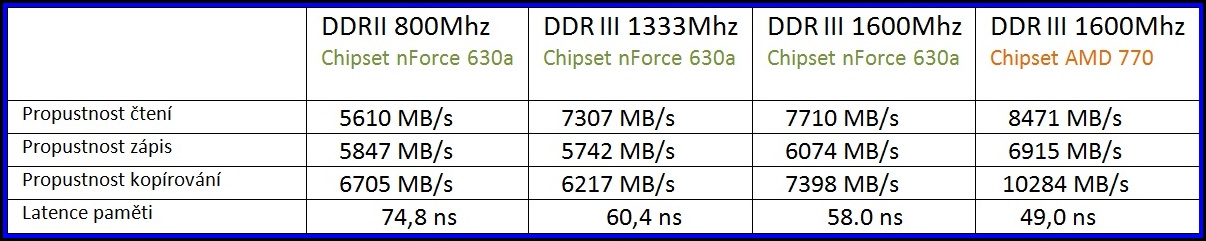 Výsledek je dle očekávání.Novější paměti DDR III jsou v testech rychlejší.Ovšem jak je vidět i volba chipsetu má vliv na výkon pamětí.S nějakým ještě novějším chipsetem ,třeba AMD 990FX by byl rozdíl určitě ješte větší.Na druhou stranu - toto jsou výsledky z testů.Reálný rozdíl na chování operačního systému nebo třeba na hraní her může být nulový.Z hlediska uživatele totiž asi nepoznáte rozdíl jestli počítač běží s pamětma DDR2 nebo DDR 3.