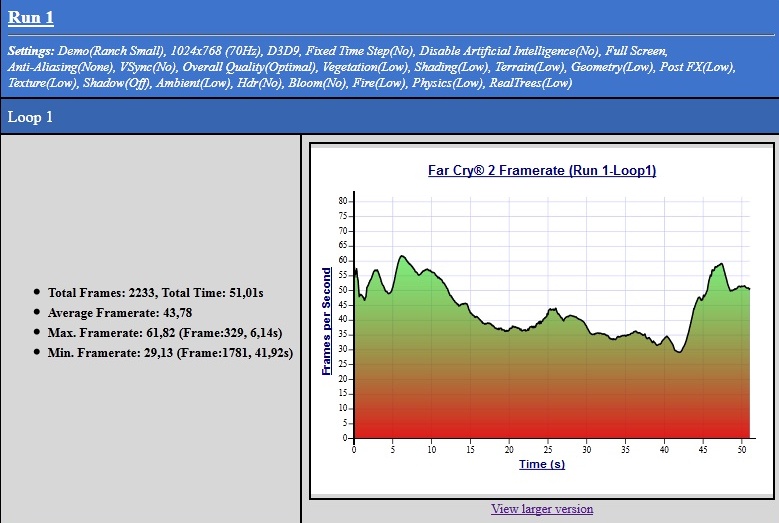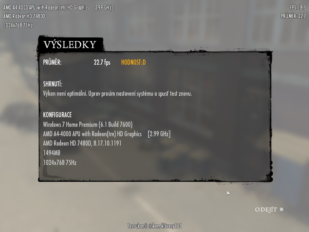 Testoval jsem integrovaným benchmarkem ze hry.Na střední detaily test proběhl hladce.FPS v tomto testu bylo kolem 25 FPS.Ovšem ve hře to bylo plynulejších 28 FPS