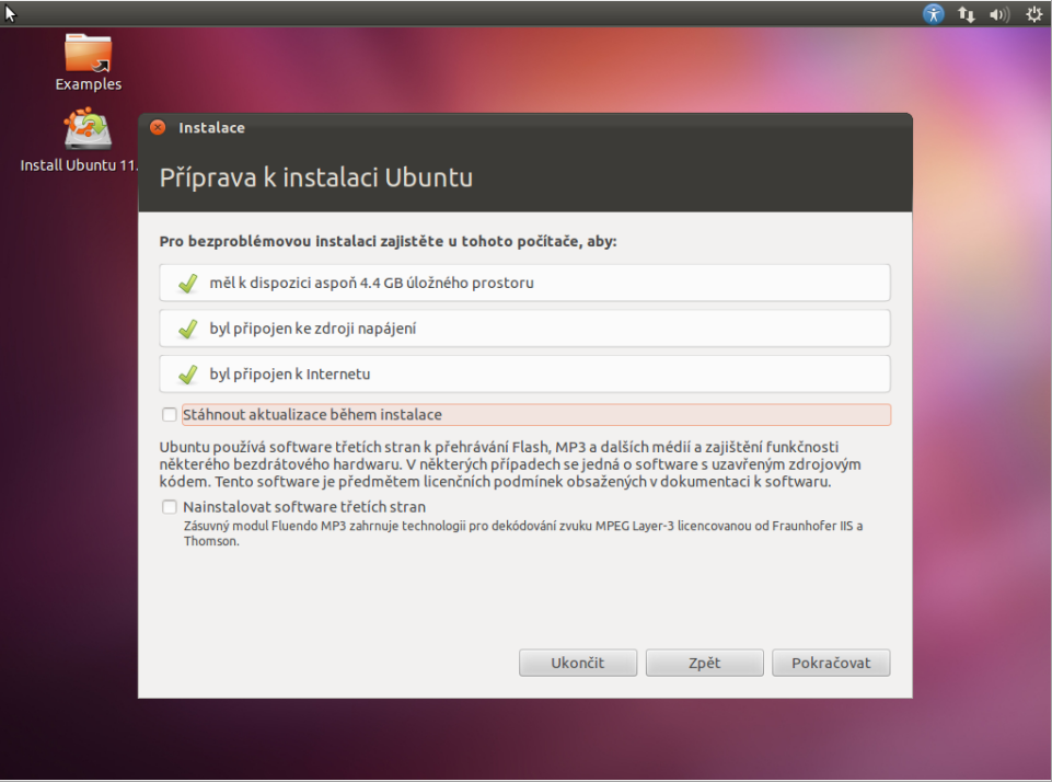 Objeví se obrazovka s minimálními nároky instalace, které splňujem