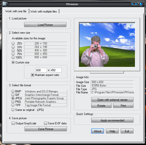 PIXresizer je aplikace pro dávkovou změnu rozměrů vybraných obrázků a digitálních fotografií. Podporovány jsou grafické formáty JPEG, GIF, BMP, PNG a TIFF. Fotografie je navíc možno rotovat, převést do odstínu šedé a provádět jejich vzájemnou konverzi atd. PIXresizer také dokáže zobrazit EXIF informace z digitálních fotografií.