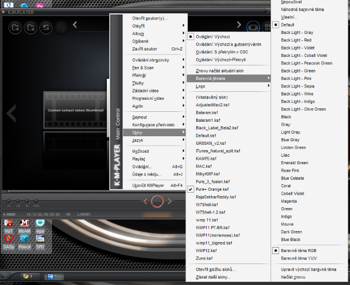 http://www.kmplayer.com/forums/index.php? Pridanie skinu: Stiahnuť na prac. plochu a vystrihnúť do priečinka Skins. Skin sa mení kliknutím pravým tlačítkom myši na horný panel otvoreného prehliadača, rozbalí sa ponuka, ísť na Skiny a vybrať si. Farby skinu sa menia v ponuke Skiny hore, možnosť vybrať si z predvolených, alebo si zvoliť vlastnú.