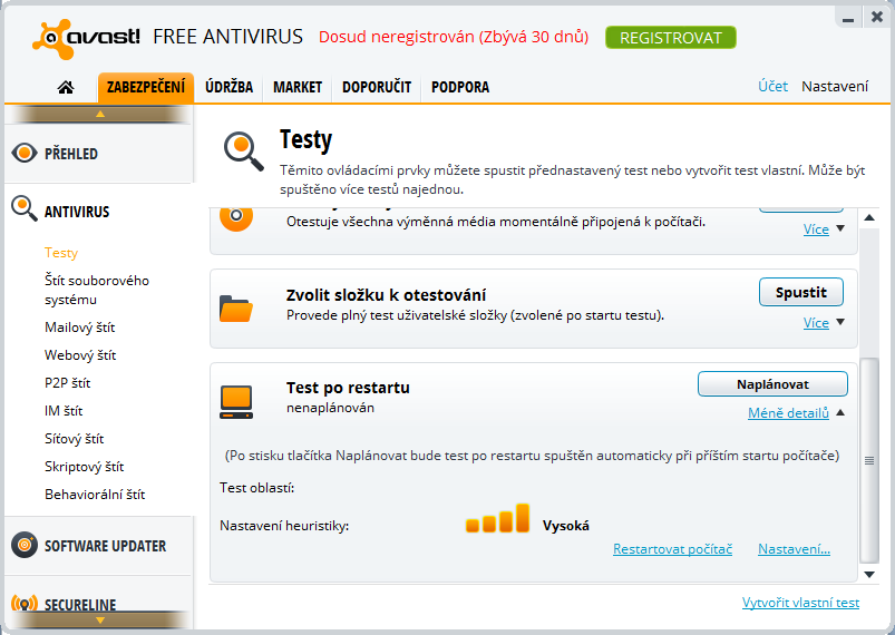 Velmi užitečnou funkcí je naplánování testu po restartu nebo při příštím spuštění počítače, který je proveden ještě před kompletním naběhnutím systému. Antivir se tedy dostává ke slovu dříve, než by jeho činnost mohl ovlivnit záškodnický program infiltrovaný do počítače. Je to efektivní způsob, jak odhalit záškodnické programy, které se po svém spuštění dovedou dobře maskovat před antivirem.