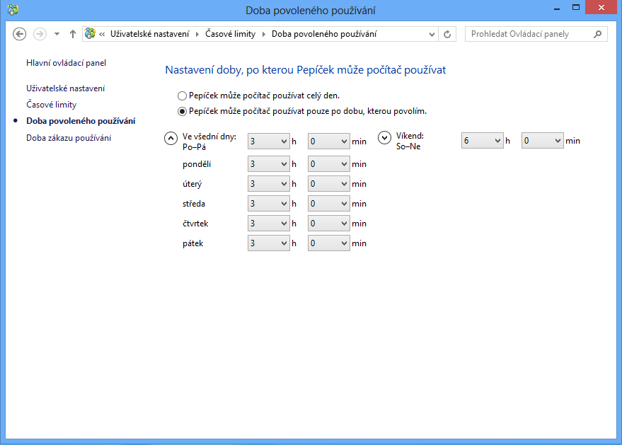 V základním nastavení lze stanovit čas pro práci s počítačem pro všední den a pro soboty a neděle. V pokročilém pak pro každý den v týdnu zvlášť. Funkce má však k dokonalosti daleko. Nezohledňuje třeba prázdniny nebo státní svátky a neumí rozlišit, jestli dítě pracuje na domácím úkolu nebo lelkuje u počítačové hry, což je poměrně zásadní nedostatek.