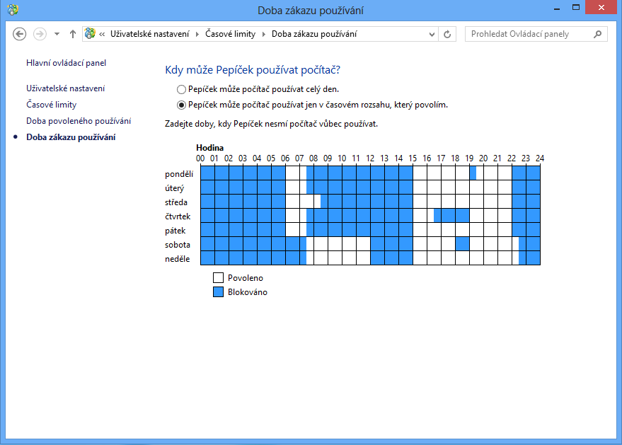 Windows 8 vylepšují omezení doby práce na počítači známé již z předešlých verzí systému. Stále je možné pro jednotlivé dny v týdnu nastavovat časová okna, kdy dítě smí či nesmí používat počítač. Nově však je možné pracovat již s třicetiminutovými intervaly namísto přespříliš dlouhých hodinových.