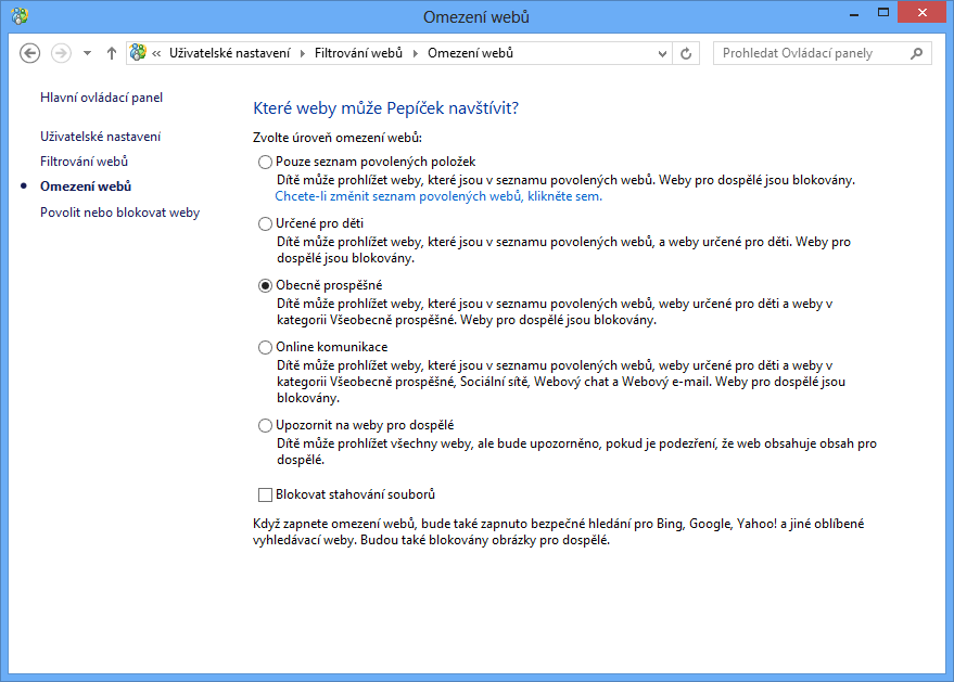 Povolit lze například jen přístup na weby určené dětem. Další stupně blokování pak blokují vždy určitý okruh webových stránek a všechny společně blokují přístup na weby tzv. pro dospělé (čili pornostránky). Je možné zablokovat přístup dětí na weby spadající do online komunikace, tedy na sociální sítě, e-mailové služby, diskusní fóra a podobně. K dispozici je také volnější režim, který pouze upozorní před přístupem na web s obsahem pro dospělé, ovšem neblokuje přístup na něj.