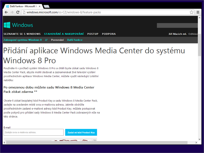 Doporučit též lze využít akce, kdy do 31. ledna 2013 je nově samostatně šířená aplikace Windows Media Center poskytována bezplatně. Zadejte do prohlížeče webovou adresu http://www.windows.cz. Navštivte sekci „Stahování a nakupování“ kde si pod nabídkou přechodu ze základních Windows 8 na Windows 8 Pro můžete do konce ledna 2013 zažádat o bezplatné zaslání produktového klíče na svou e-mailovou adresu.