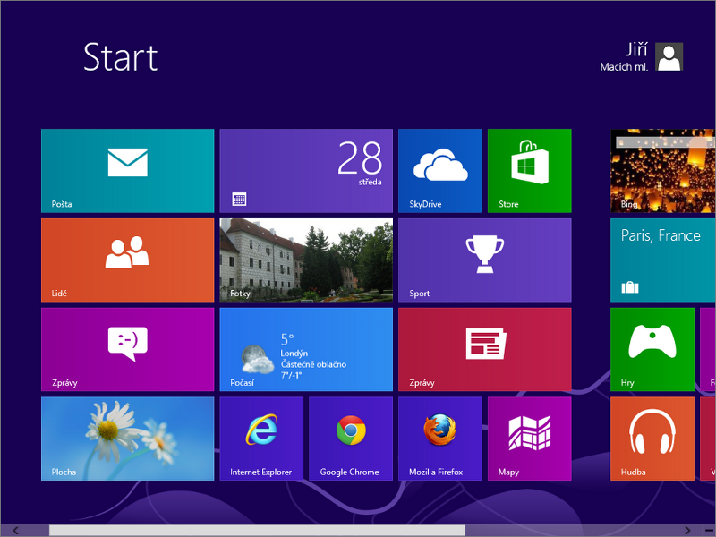 Po vytvoření účtu nebo přihlášení ke stávajícímu se budou střídat barevné obrazovky informující o dalších krocích připravujících systém k prvnímu spuštění, dokud se neobjeví už notoricky známá úvodní obrazovka Start nového prostředí Modern UI se svými dlaždicemi a reprezentujícími předinstalované aplikace bohužel dosti nevalné kvality.
