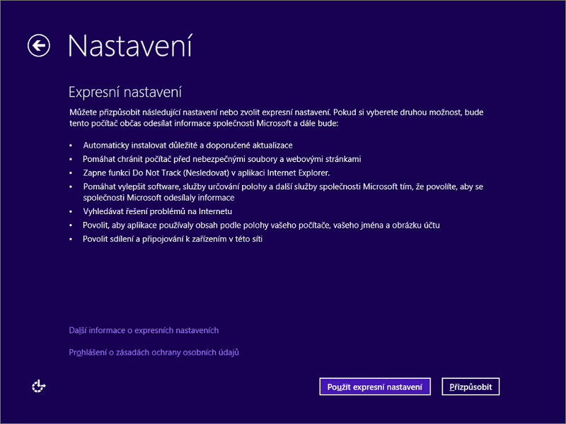 Nejprve si vyberte barevný motiv prostředí Modern UI (Metro) a zvolte název počítače. Obě volby můžete později změnit, takže není třeba nad nimi sáhodlouze přemýšlet. Následně si můžete vybrat mezi expresním automatickým nastavením a vlastním nastavením krok za krokem. Expresní nastavení neskrývá žádnou záludnost, takže lze použít jej.