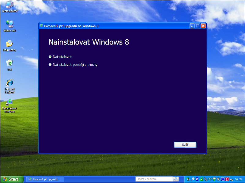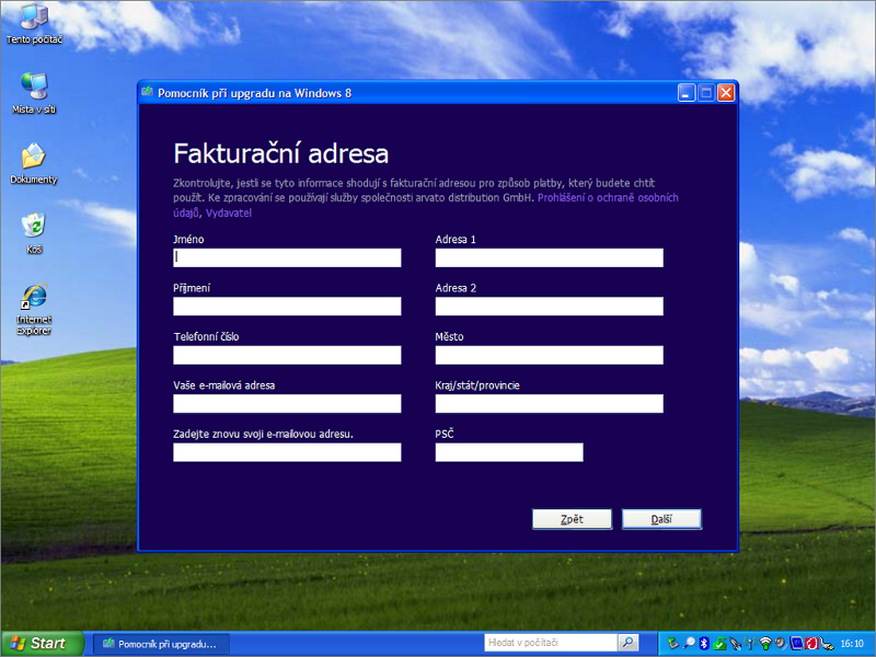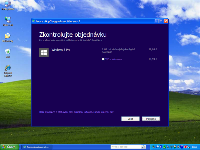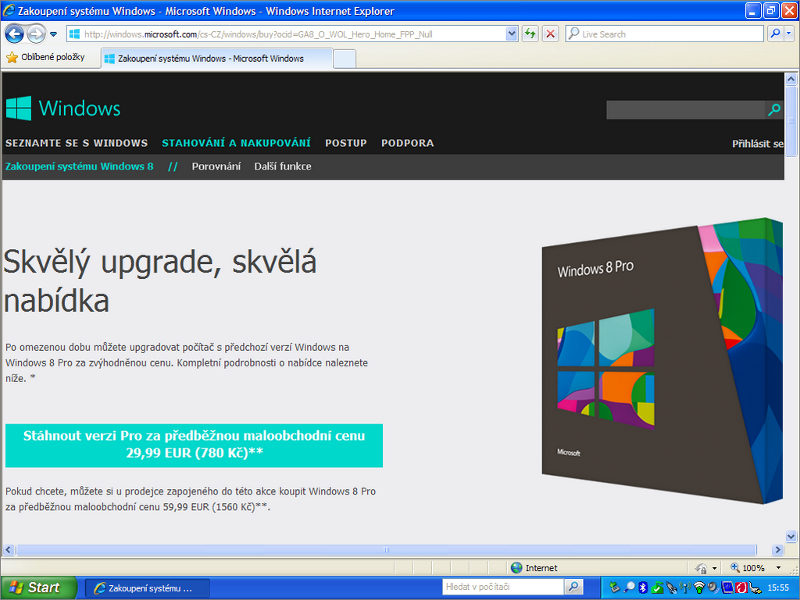 V přepočtu tedy zhruba za 780 Kč. Netřeba kamkoliv chodit, vše lze vyřídit z pohodlí domova přes Internet. Do dvou hodin můžete mít na svém stávajícím počítači třeba namísto 11 let starých Windows XP zbrusu nová Windows 8 Pro.