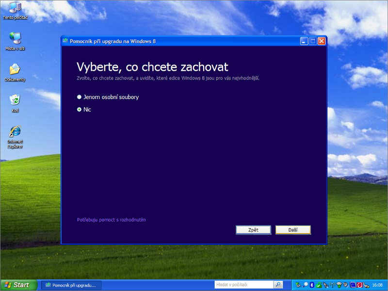 Jestliže jste nenarazili na skutečně závažný problém s kompatibilitou, můžete se v průvodci programu Pomocník při upgradu na Windows 8 posunout o krok dále. Pomocník vám dá vybrat, co si přejete zachovat ze současné instalace systému. V případě Windows Vista a Windows 7 může jít o uživatelské soubory (osobní soubory) a některá nastavení systému. Při přechodu z Windows XP je možné zachovat jen osobní soubory.