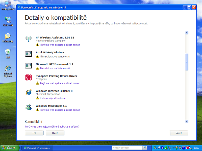 Jestliže máte nainstalované nějaké obslužné utility k hardwaru od výrobce počítače, s největší pravděpodobní budou označeny za nekompatibilní. Nevadí. Jen málokteré mají opodstatnění pro svou přítomnost v systému. Co se týče samotných ovladačů, tak ty si Windows 8 dovedou velmi spolehlivě i pro starší hardware najít přes Windows Update.