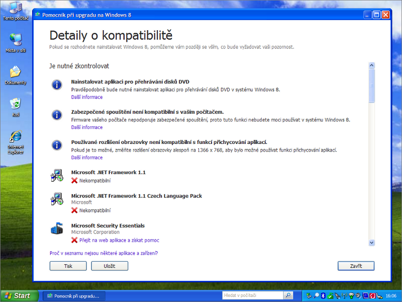 Lze též narazit na kuriózní hlášení o nekompatibilitě týkající se pod Windows XP třeba webového prohlížeče Internet Explorer 8, antivirového programu Microsoft Security Essentials či zastaralého komunikačního programu Windows Messenger. Žádný z těchto softwarových exemplářů nemusíte oplakávat.