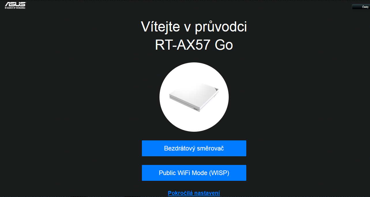 Po zapnutí routeru stačí k jeho nastavení napsat do adresního řádku prohlížeče adresu http://www.asusrouter.com. Následuje uvítací obrazovka: