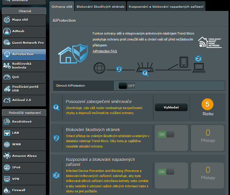 AiProtection: Spolupráce s Trend Micro umožňuje včasné odhalení škodlivých stránek a rozpoznání napadených zařízení.