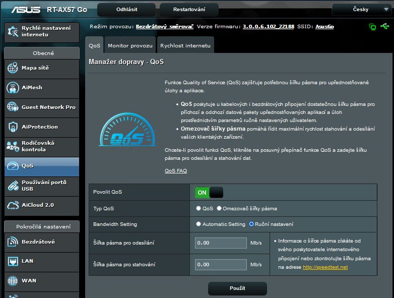 QoS: Možnosti nastavení jsou oproti jiným routerům omezeny na standardní QoS a jako omezovač šíře pásma.
