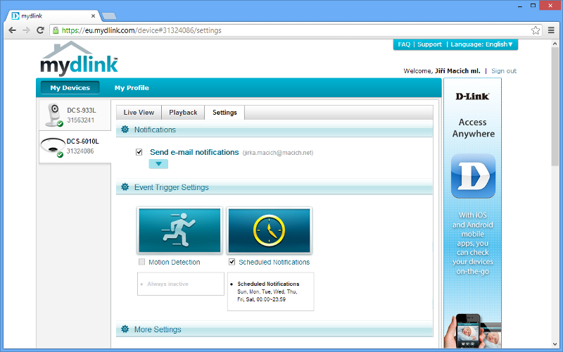 Podobnost s e-mailovou schránkou ovšem nespočívá jen v jednoduchém založen uživatelského účtu. Platforma mydlink umožňuje přistupovat k vlastním IP kamerám přes Internet z webového prohlížeče anebo díky aplikaci pro Android a iOS i z chytré mobilní elektroniky. Obdobně jsou na tom mnohé e-mailové služby. Jedná se přitom o plnohodnotný přístup.
