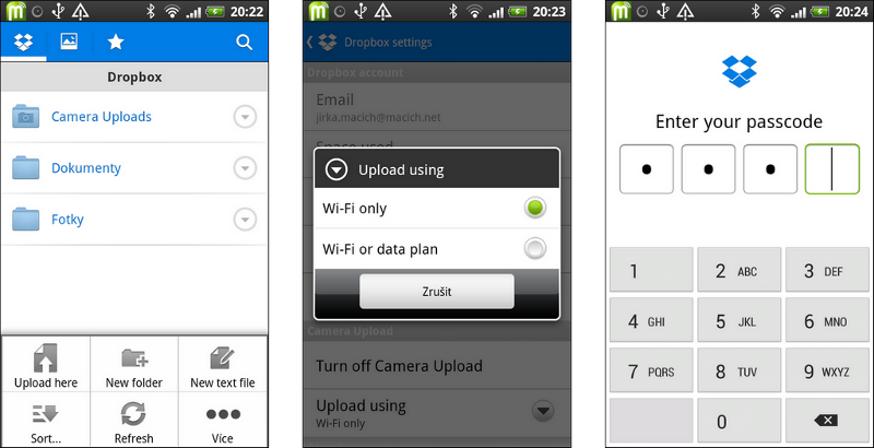 Volitelně si lze nastavit také zámek pro přístup k aplikaci Dropbox, který představuje čtyřmístný PIN. Není tedy nutné se neustále odhlašovat a přihlašovat se složitým zadáváním e-mailové adresy a dlouhého hesla. PIN je kompromisem mezi bezpečnostní a komfortem. Navíc si lze nastavit, že po desátém chybném zadání se automaticky ze zařízení smažou data pocházející z úložiště Dropbox.