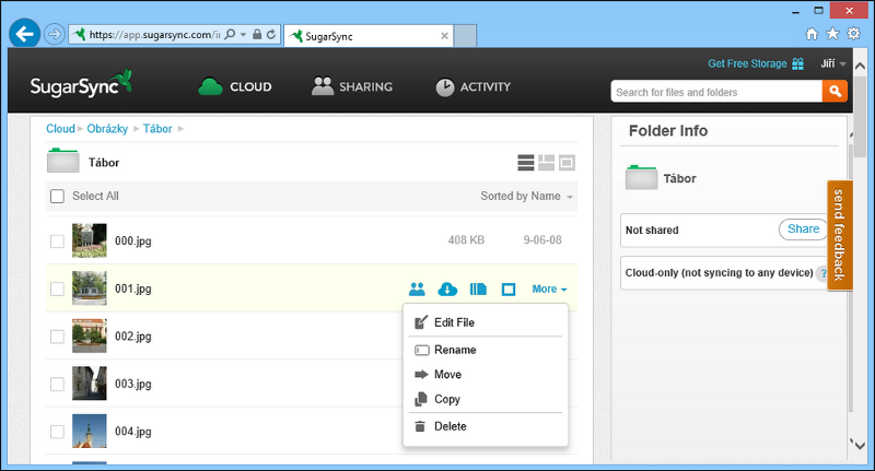 Rovněž je možné soubory z pevného disku prostřednictvím webového rozhraní nahrávat do cloudového úložiště. V moderních prohlížečích stačí jejich prosté přetažení z desktopového prostředí. SugarSync bohužel neoplývá napojení na žádnou sadu kancelářských webových aplikací. Webové rozhraní může nabídnout jen jednoduchý prohlížeč fotografií.