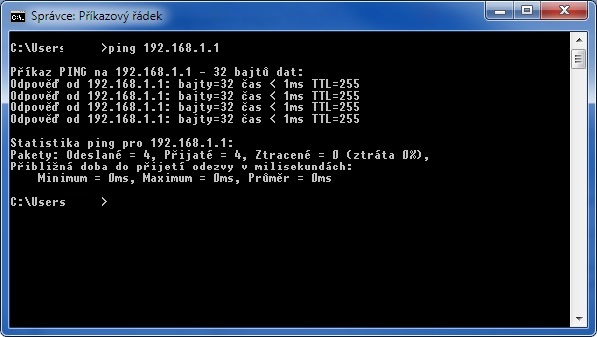 4. Zkontrolujeme vlastní spojení sítě. V příkazovém řádku napíšeme příkaz "ping 192.168.1.1" - ano, ping na "bránu".