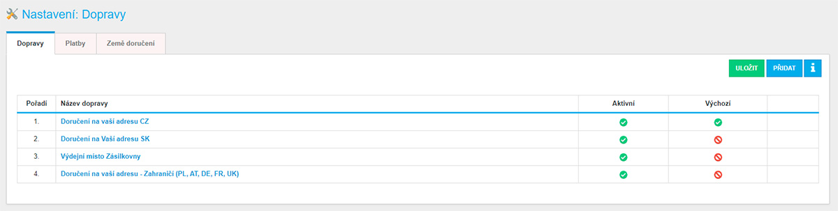 - Česká pošta, Zasilkovna, PPL, DPD, TopTrans, InTime, Geis, GLS, Uloženka, Balikobot.