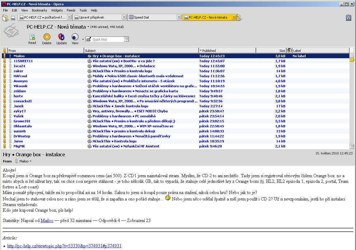 Nová témata se načítají hezky za sebe, díky tomu získávám jedinečný přehled o nových tématech v konkrétních dnech - mohu je různě označovat, řadit, mazat... Navíc, pokud mám Operu zapnutou a věnuji se jiné práci, upozorní mě prohlížeč o nových tématech pop-up oknem v pravém spodním rohu obrazovky. :bigups: