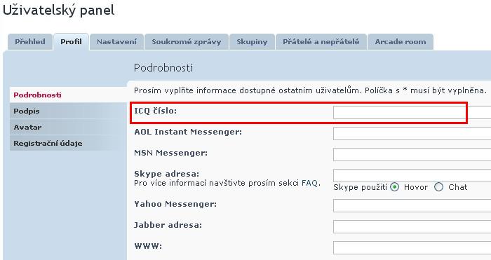 Vaše ICQ číslo si můžete nastavit v uživatelském profilu. Po té bude tlačítko pro ostatní přihlášené viditelné a funkční.