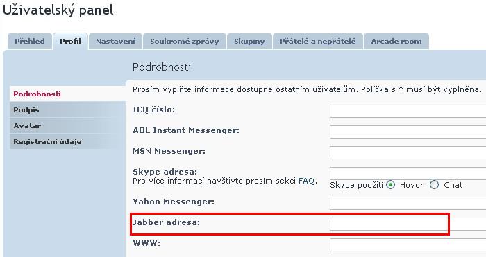 Nastavení "Jabber" adresy - pro zvětšení klikni