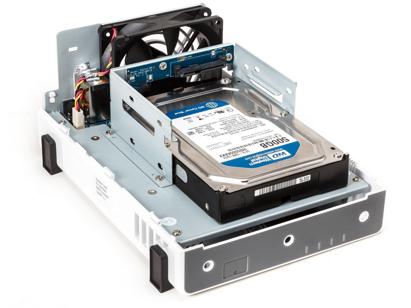 Disky jsou chlazeny 92mm ventilátorem umístěným na zadní straně zařízení s automatickou regulací otáček a možností relativního nastavení výkonu. Celková hlučnost zařízení i s instalovanými disky by podle výrobce neměla překračovat 20 dB(A). Z vlastní zkušenosti mohu potvrdit, že tento NAS server obecně patří k těm tišším. V bytě jej lze instalovat do libovolné místnosti, aniž by obtěžoval provozními hlukem. Plastový plášť velmi dobře izoluje i tradiční „chroupání“ disků.