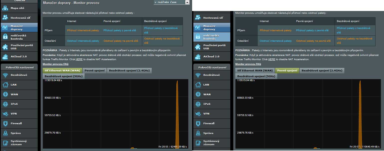 4. Zkontroluj v monitoru provozu, zda je WAN a LAN rychlost stejná - je možné, že zatímco měříš, tak jiný PC stahuje a tak spotřebovává pásmo:
