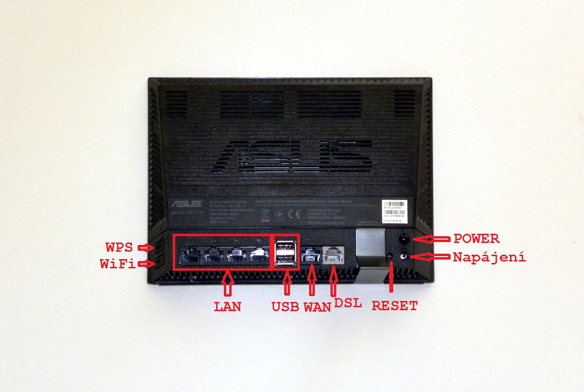 Veškeré konektory (porty) a ovládací prvky, až na WPS a WiFi, jsou na zadní straně. Pro ty, co zásadně ztrácejí manuály, je na zadní straně uvedeno výchozí heslo a IP adresa po továrním restartu.