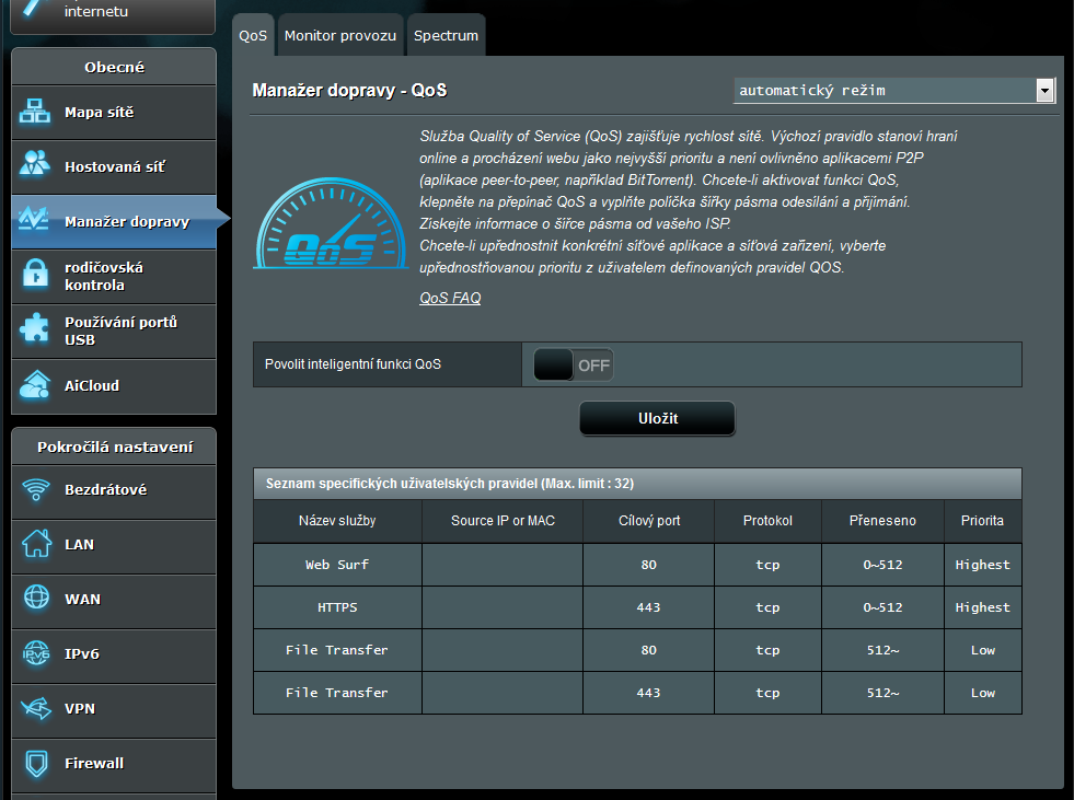 Nechybí ani "Manažer dopravy" pomocí nějž můžeme omezit datový tok (např. pro přenos souborů) a preferovat jiný datový tok (např. http pro hry). Hračičkové určitě vyzkouší vazbu na MAC (IP) adresy.