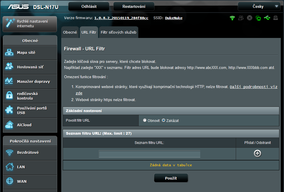 Router disponuje i URL filtrem, kde můžete zakázat určité www stránky. Tráví-li vaše ratolest příliš mnoho času na facebooku, místo toho, aby se věnovala učení, stačí inkriminovanou stránku vložit do filtru.