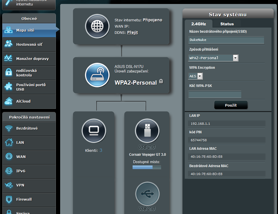 A jak je u Asusu dobrým zvykem, nechybí zde ani mapa sítě. kromě jiného zde najdete i informaci o počtu připojených klientů, informace o WiFi, IPadresu WAN, MAC adresy a také informaci o připojených USB zařízeních, včetně volného místa na USB discích.
