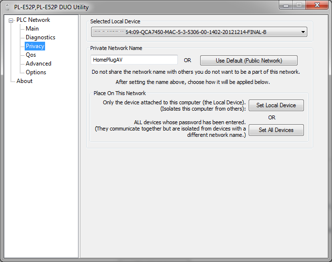 Samotné powerline adaptéry nepožadují žádné nastavení. Po el. síti lze provozovat i více sítí, pak lze adaptéry "spárovat" pomocí tlačítka "Security". Stisknete tlačítko na těch adaptérech, které k sobě mají patřit - ony se mezi sebou "domluví" a je hotovo. Pokud byste však chtěli nastavit další vychytávky, pak budete potřebovat Ovládací SW PL-E52P utility. Zde bych měl malou výtku - uvedený sw umí pracovat jen s adaptérem připojeným k PC. Další adaptéry v síti bohužel nenajde. Je tedy třeba jej nainstalovat na všechny počítače, které jsou připojeny k adaptéru, nebo na notebook a postupně je obejít, či adaptéry po nastavení přehodit.