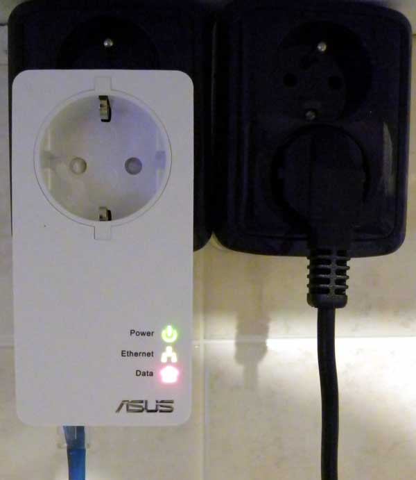 Kdo s powerliny pracoval, tak ví, že pro správnou funkci je třeba, aby oba adaptéry byly na stejné fázi. Zajímalo mě proto, jak budou adaptéry reagovat na zapojení do rozdílné fáze. Zde musím Asus pochválit. Adaptéry zapojení do rozdílné fáze - tedy špatné podmínky - indikují zčervenáním LED "Data". I tak ale spojení naváže, pouze rychlost je znatelně menší.