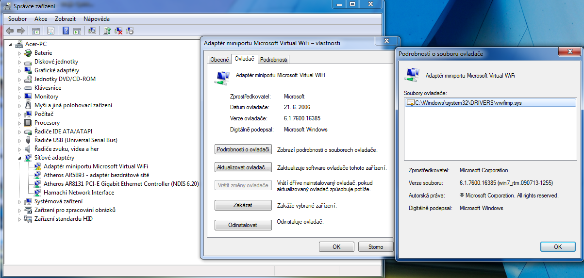 Jenže ty neaktualizuješ ovladač WiFi adaptéru AR5B93, ale snažíš se aktualizovat ovladač virtuálního WiFi adaptéru.