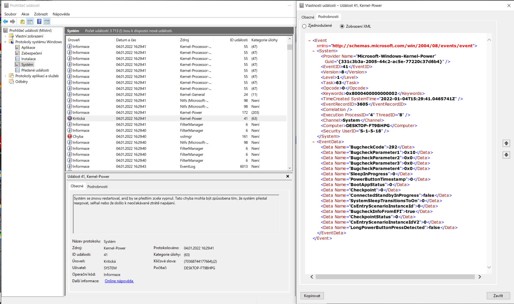 Jenom dodám, že s náhodným restartem způsobeném Kernel Power 41 se potýkám taky, koukal jsem přes "hledat" a dost lidí má stejný problém, počkám, než tu někdo pomůže, protože nás to všechny trápí, do té doby nebudu zakládat nové vlákno se stejným problémem.