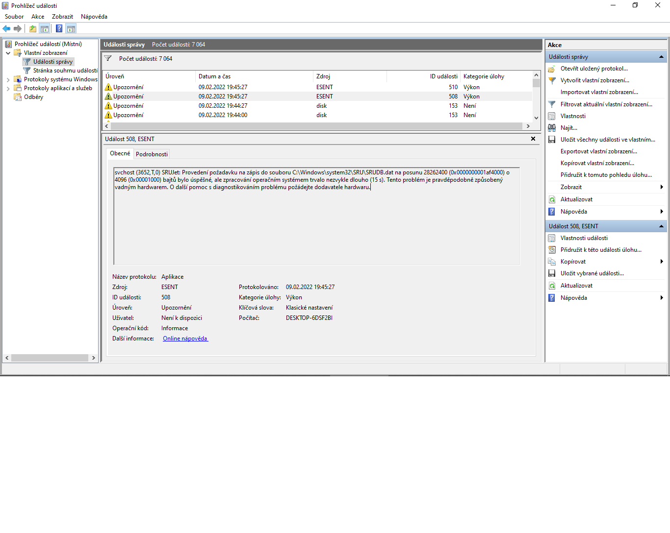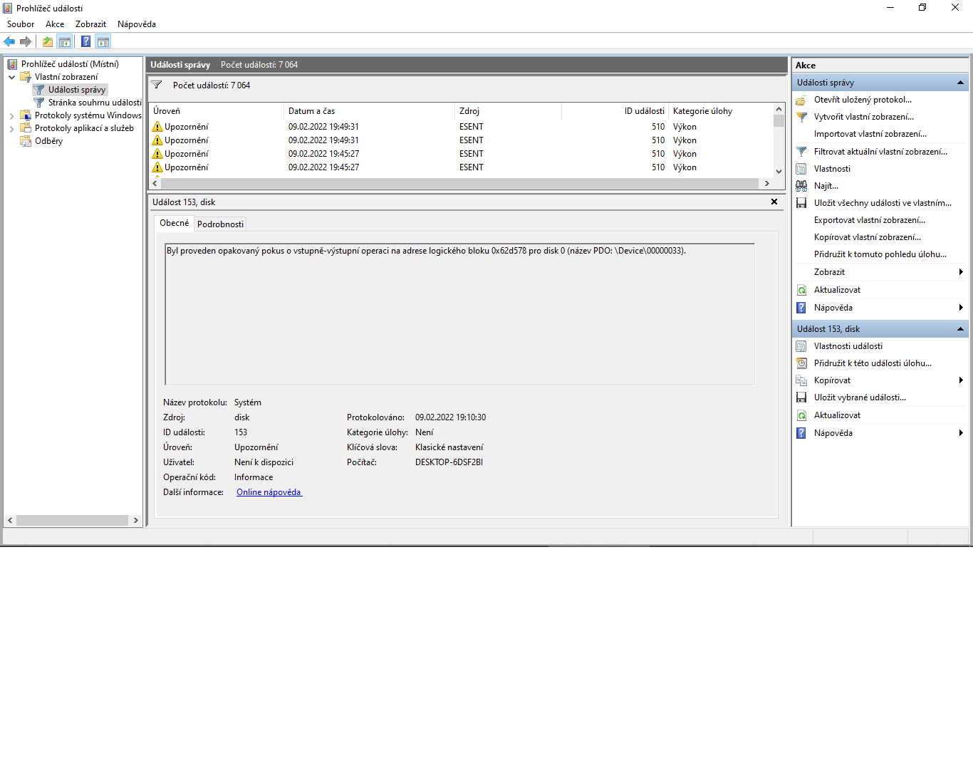 16.2. pád procesu MemCompression způsobený ovladačem hardware_disk. V eventlogu zpráva Disk 2 byl neočekávaně odebrán. Může souviset s předchozím.