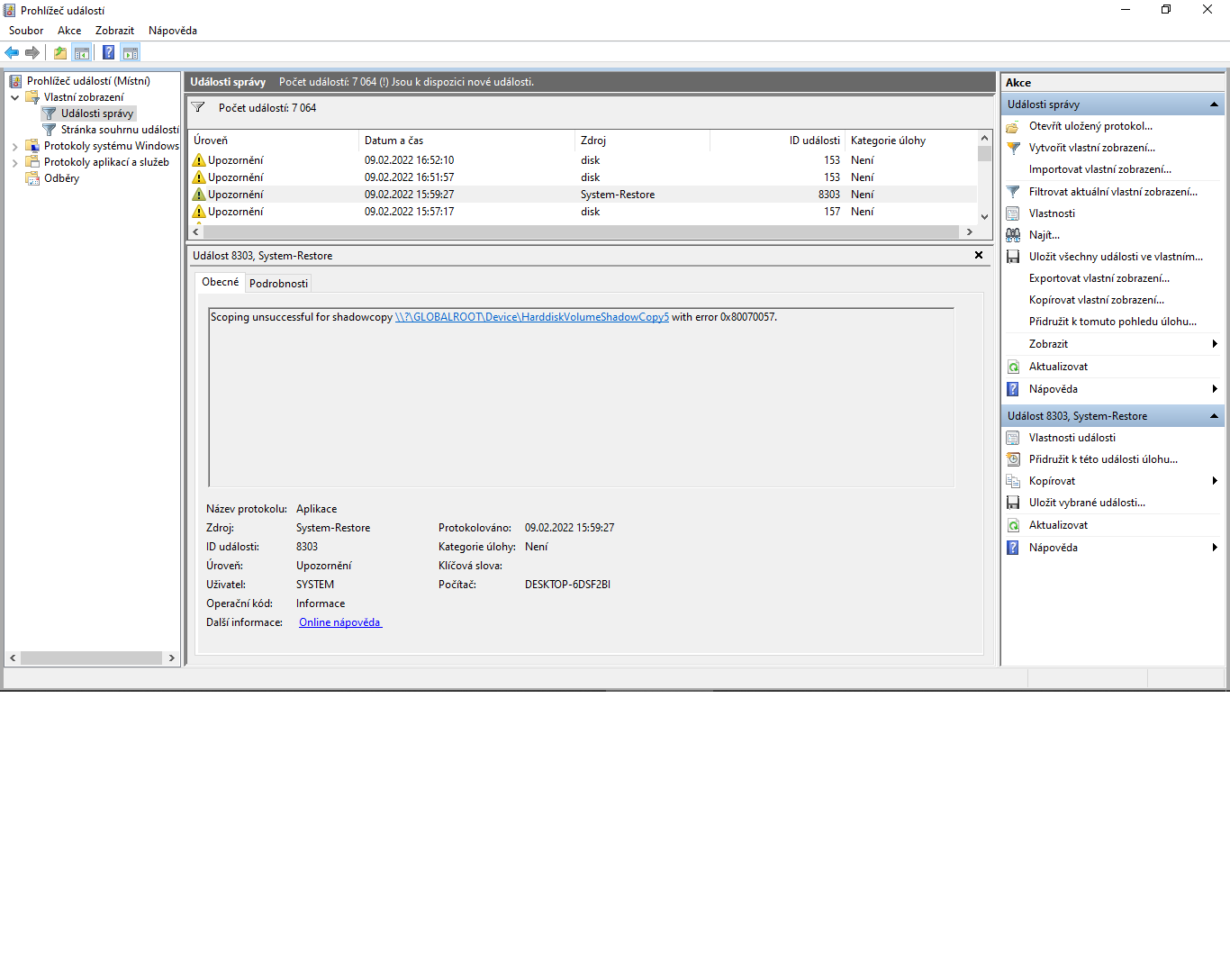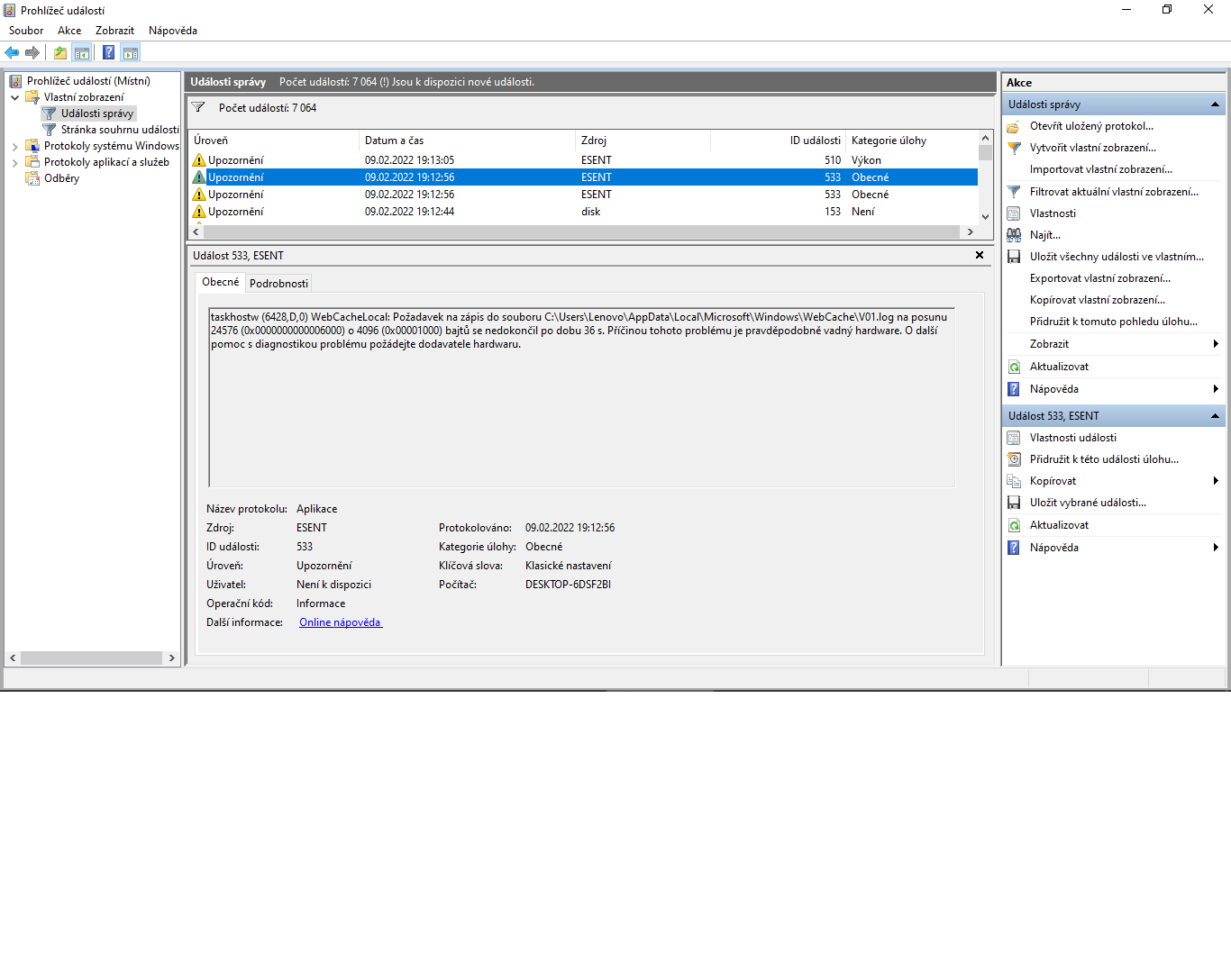 Kromě toho v eventlogu nalezeny spusty chyb při pokusu o zápis na disk, stejně tak nalezeny další pády, ale s nemožností zapsat na disk minidump.