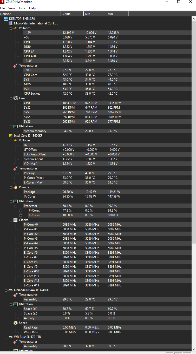 Přikládám i fotky HWmonitoru po Heavyload zátěží. Musím říct akorát, že GPU neodpovídá teplotám, které mám při hraní. Tam to skáče až na 90°C. U Cyberpunk se stalo že i na 100°C. Obzvlášť, když nemám otevřený boční panel.
