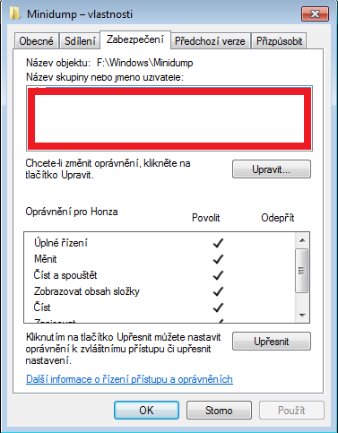 Klikni pravým tlačítkem myši na tu složku "Minidump", vyber "Vlastnosti" a poté klikni na záložku "Zabezpečení". Kolik položek máš v tom okénku, které jsem Ti označil v příloze a kolik účtů má počítač?
