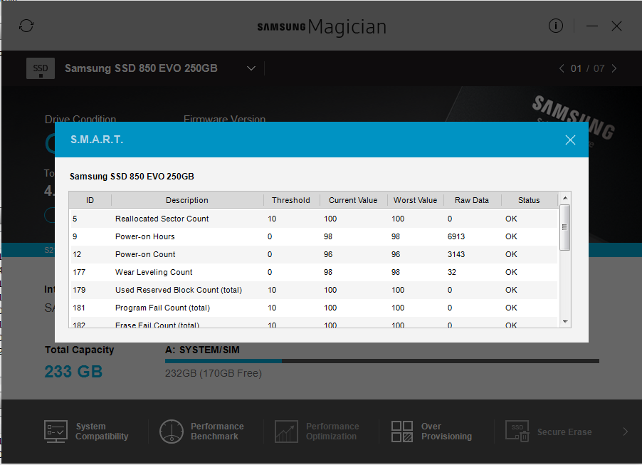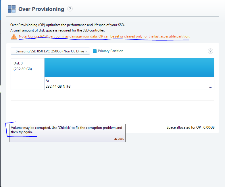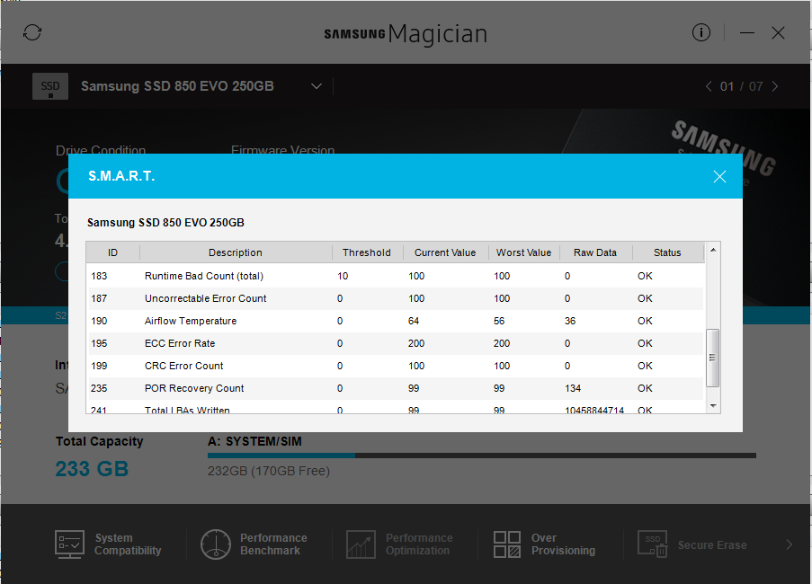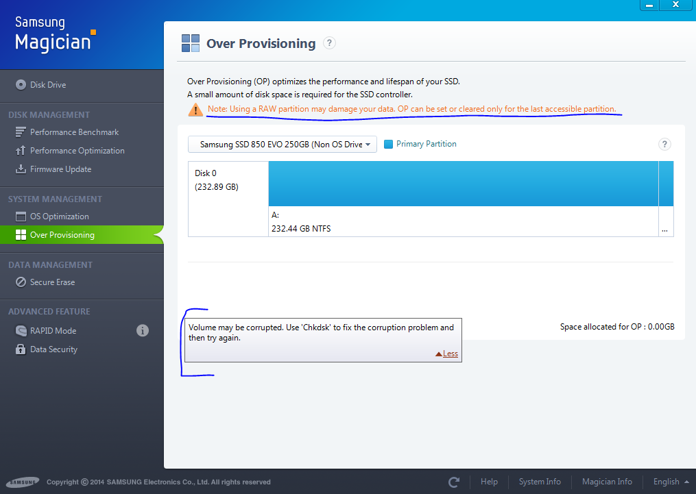 Tohle všechno už jsem zkusil. Samsung Magician samozřejmě používám. Zapsáno nemám ani 5 TB, jediné, čeho jsem si všimnul je to, že najednou jsou rychlosti náhodného zápisu a čtení podprůměrné, byť mírně, ale stejně je to průměrně méně, než jsem pozoroval před závadou. Dále pak pokud kliknu na záložku Over Provisioning, tak tam je dole napsáno, že Volume may be corrupted. Use CHKDSK to fix the corruption problem and then try again. Při startu Win7 pořád spouští chkdsk pro tenhle disk.