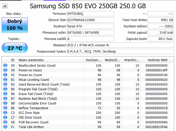 Výše je výpis z Crystalu, kde je i tenhle SSD a já si nejsem jistý, jak by měl vypadat zdravý SSD disk. Ale řekl bych, že takhle ne, může mi to někdo potvrdit?
