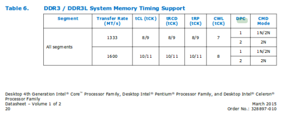 V tabulce z datasheetu CPU je sloupec DPC jako počet modulů na kanál. Když máš 2, tak k tomu patří CMD mode 2N, takže to je commad rate 2 v biosu a časování tady je doporučené 10-10-10 ta 11 za lomítkem je pro DDR3L.